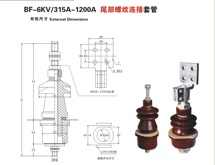 BF-6KV/315A~1200A尾部螺纹连接变压器套管