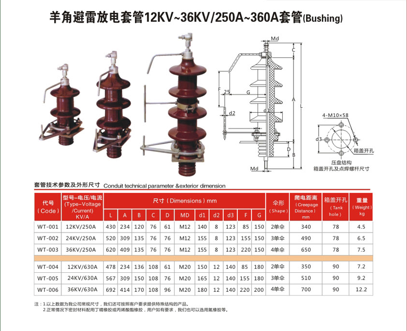 羊角避雷放电变压器套管12KV~36KV/250A~360A套管