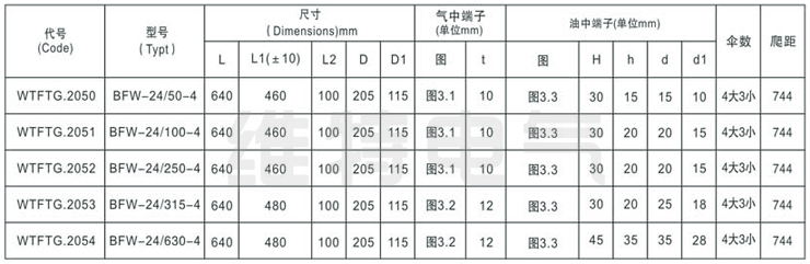 B-变压器用;D-单体瓷绝缘;F-复合瓷绝缘;J-有附加绝缘:W-防污;L-穿缆(或可装电流互感器),套管型号中“广前 的数字表示额定电压(KV ) 后的数字表示额定电流(A)。