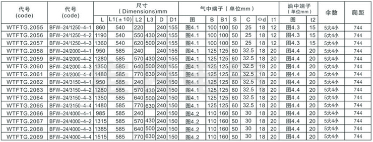 B-变压器用;D-单体瓷绝缘;F-复合瓷绝缘;J-有附加绝缘:W-防污;L-穿缆(或可装电流互感器),套管型号中“广前 的数字表示额定电压(KV ) 后的数字表示额定电流(A)。