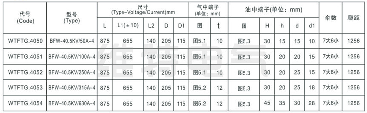 B-变压器用;D-单体瓷绝缘;F-复合瓷绝缘;J-有附加绝缘:W-防污;L-穿缆(或可装电流互感器),套管型号中“广前 的数字表示额定电压(KV ) 后的数字表示额定电流(A)。